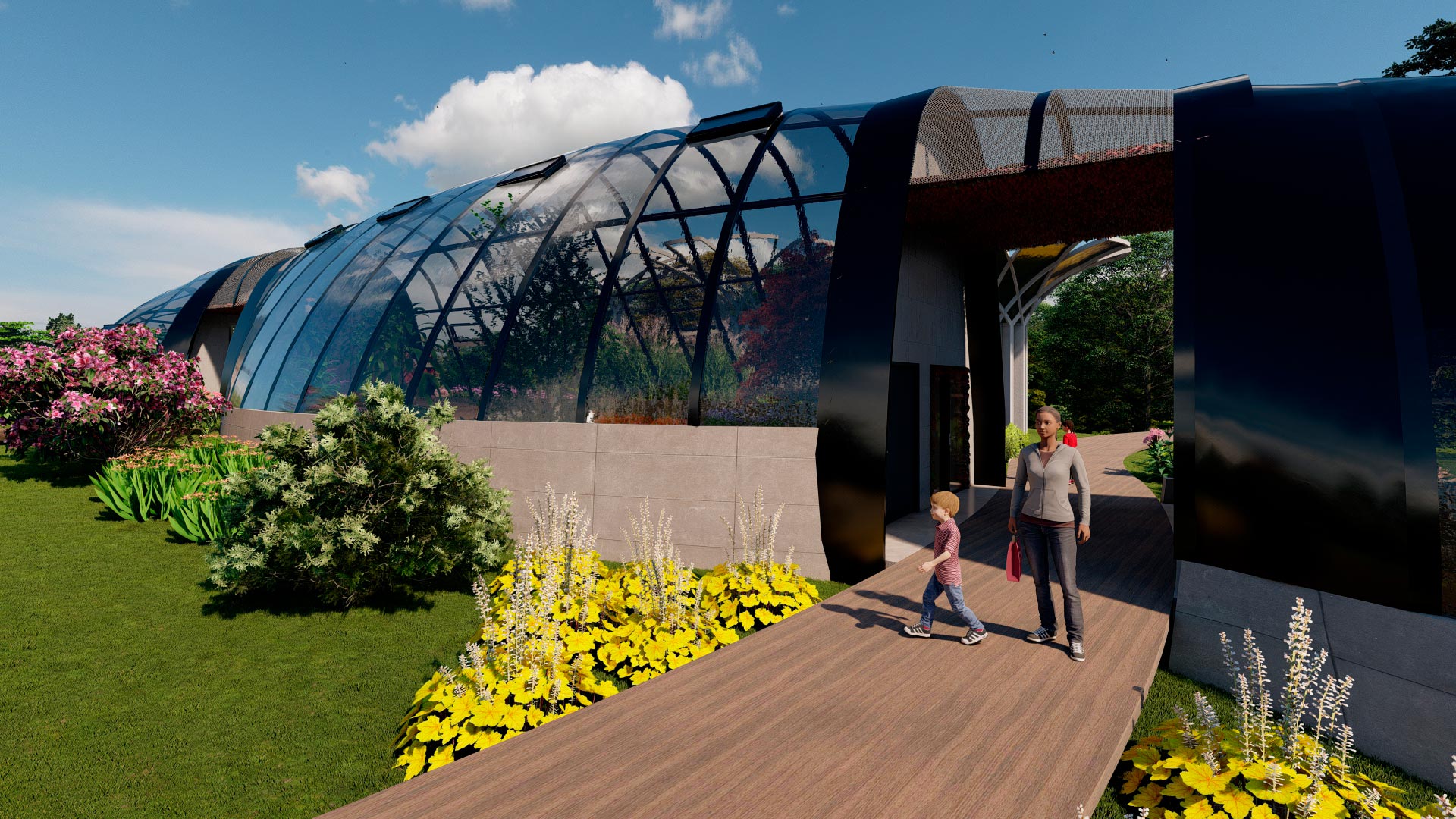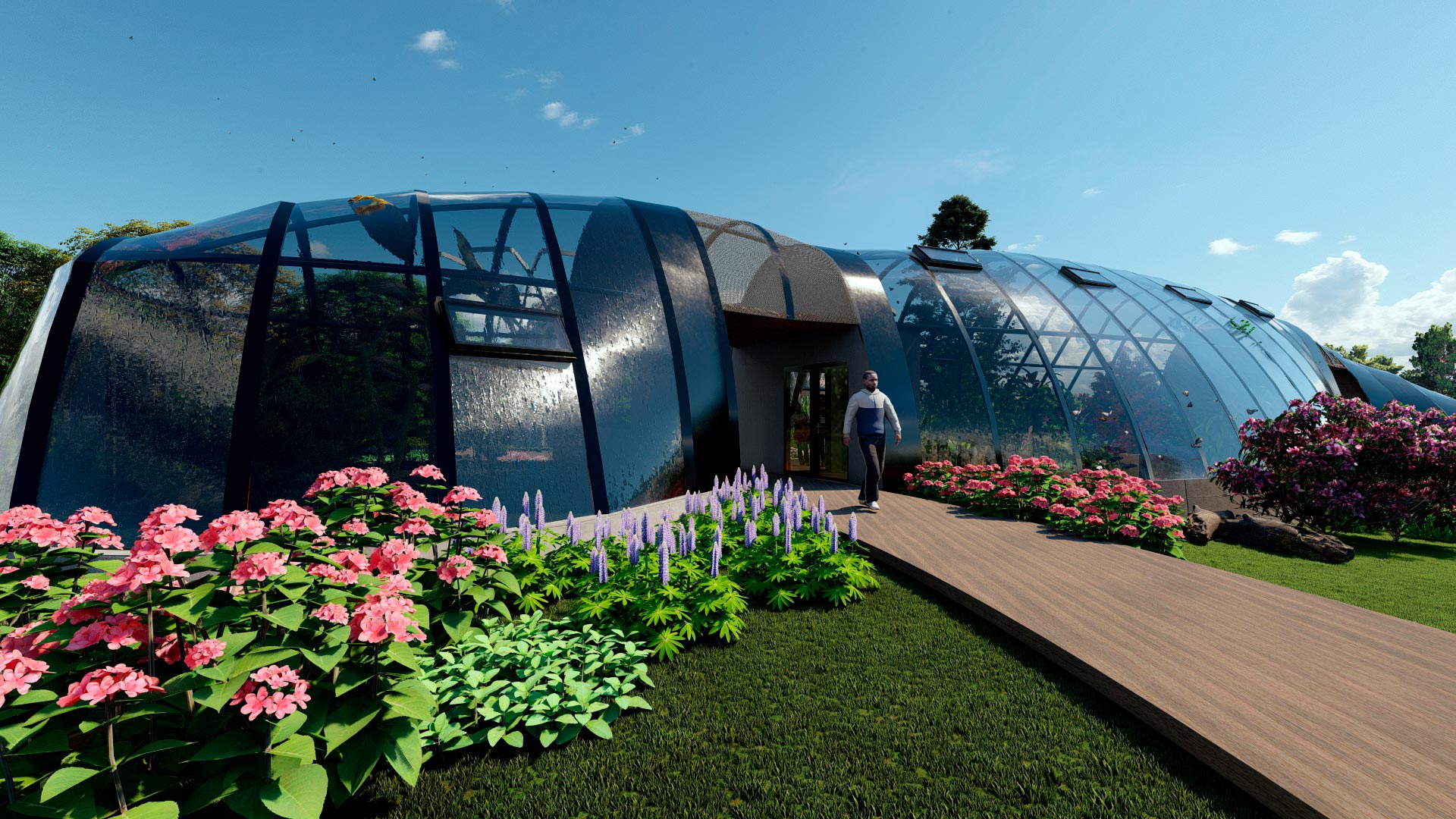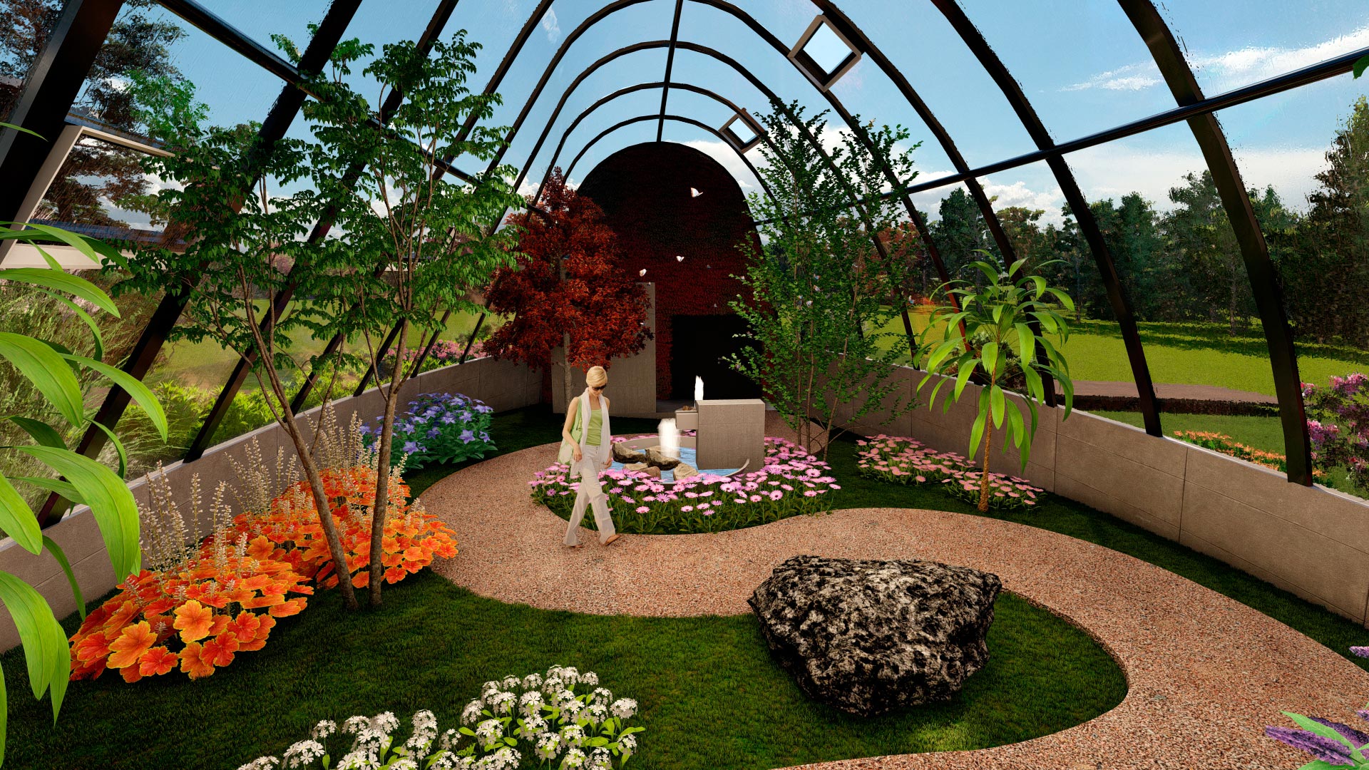 El primer espacio con unos 69.06 m2 contiene un jardín controlado con plantas para la oviposición de las mariposas, debido a lo frágil de este proceso, solo es de acceso del personal técnico del mariposario. - En la nave central se desarrolla el área de exhibición del mariposario para acceso al público, con un área aproximada de 165.85 m2 y una altura de 6m, generando un espacio amplio de vuelo y posicionamiento.