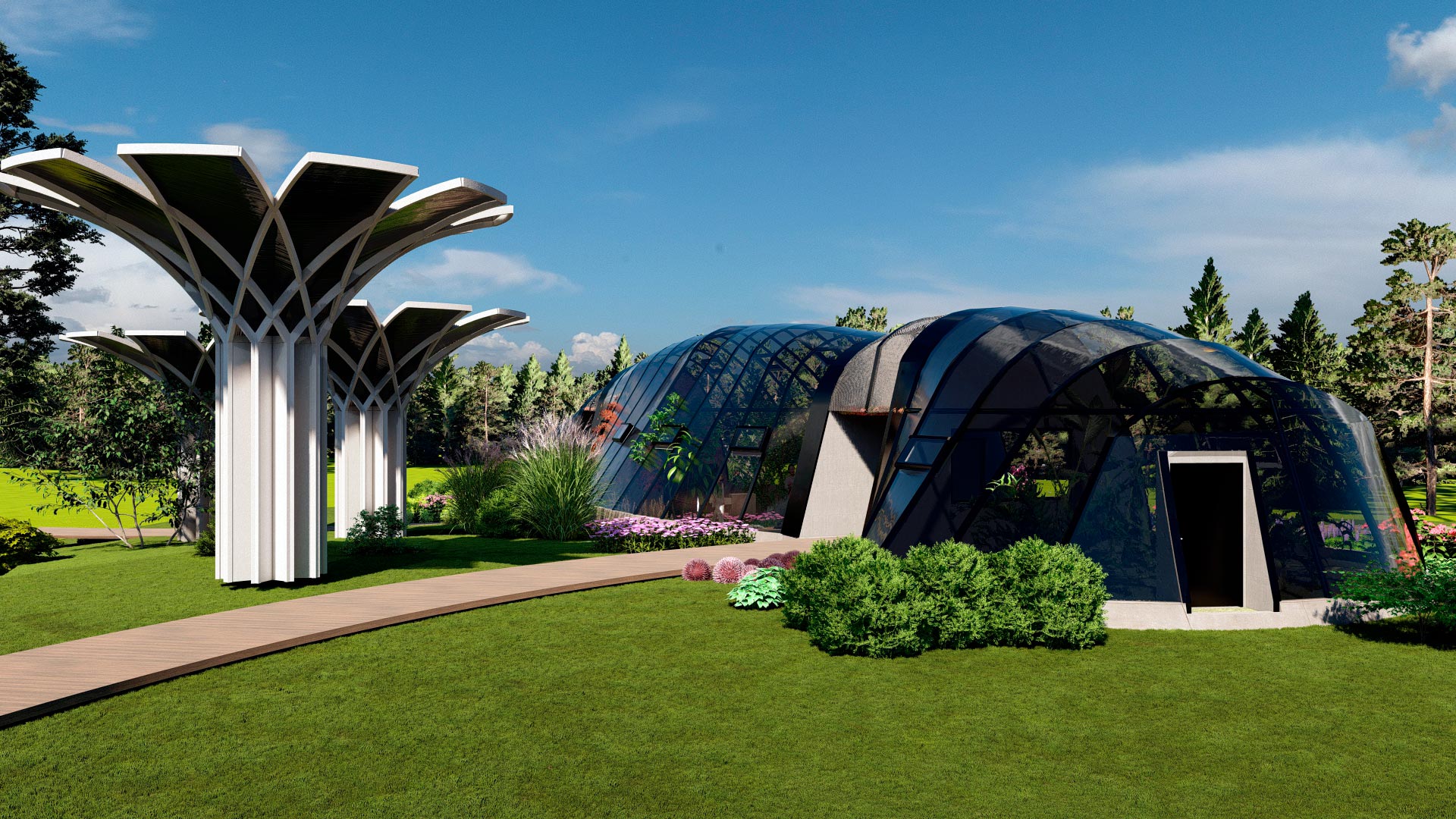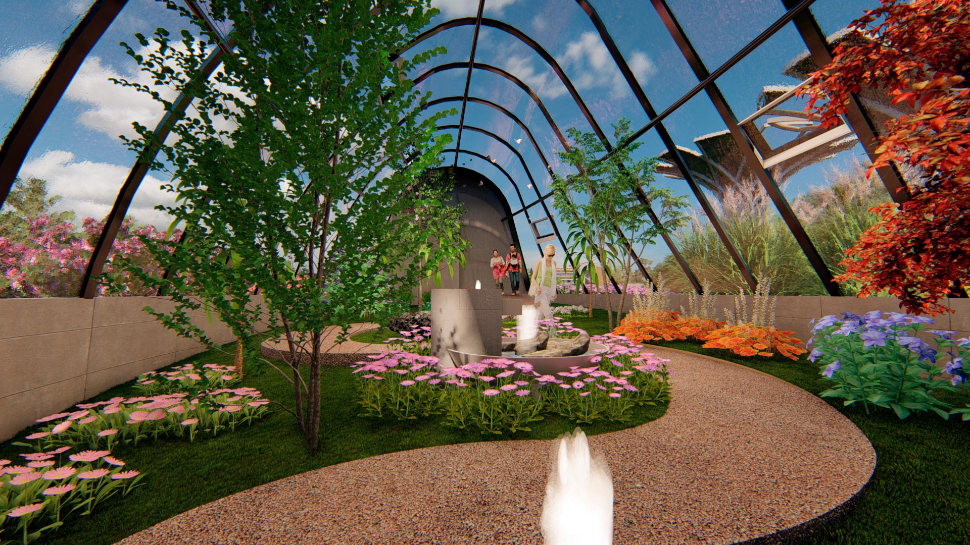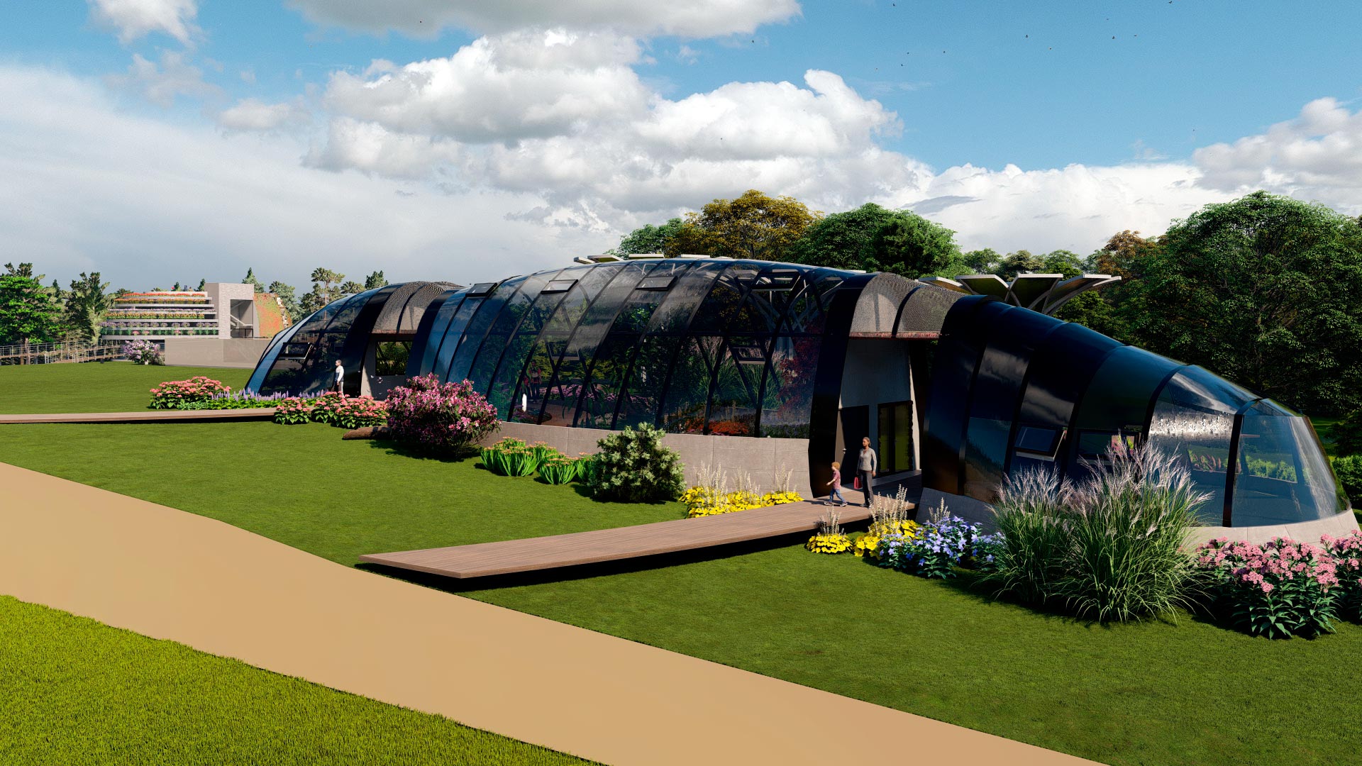 El primer espacio con unos 69.06 m2 contiene un jardín controlado con plantas para la oviposición de las mariposas, debido a lo frágil de este proceso, solo es de acceso del personal técnico del mariposario. - En la nave central se desarrolla el área de exhibición del mariposario para acceso al público, con un área aproximada de 165.85 m2 y una altura de 6m, generando un espacio amplio de vuelo y posicionamiento.